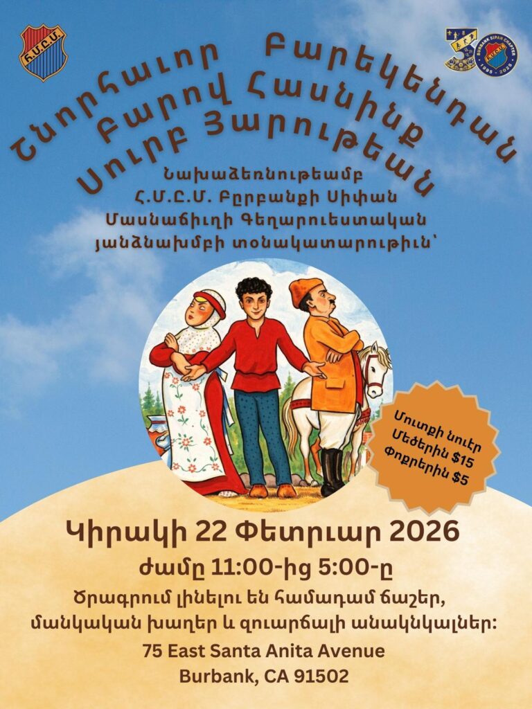 Happy Barekendan! The Homenetmen Burbank Sipan Cultural Committee cordially invites everyone to our festive celebration. The program will include delicious meals, children’s games, and fun surprises.