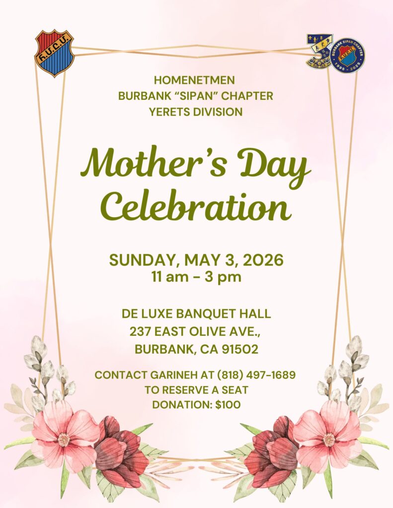 The Yerets Division of the Homenetmen Burbank “Sipan” Chapter invites you to a special luncheon honoring all the wonderful mothers in our community. Join us for an afternoon of celebration, connection, and joy.